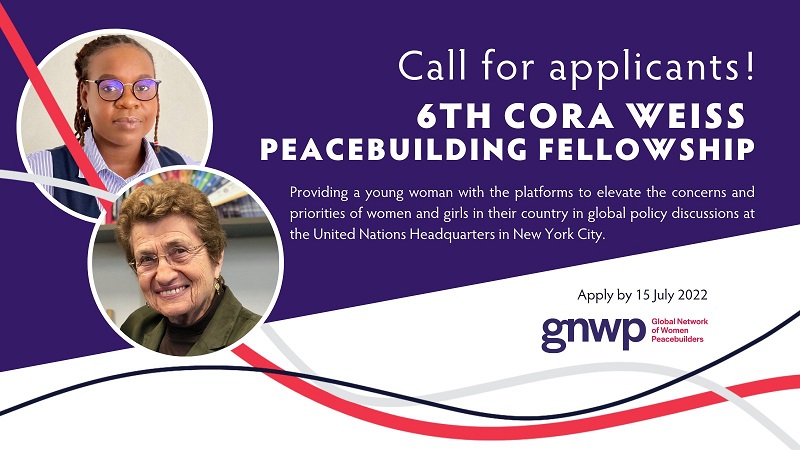 The Global Network of Women Peacebuilders (GNWP) is pleased to announce its sixth annual Cora Weiss Fellowship for Young Women Peacebuilders. Launched in 2015, the Fellowship aims to support the development of young women peacebuilders and ensure that more young people share Cora’s vision for sustainable peace and gender equality as strong and integral parts of our global culture. The Fellowship provides a young woman with the opportunities and platforms to elevate the concerns and priorities of women and girls in their country in global policy discussions at the United Nations Headquarters in New York City.